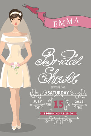 レトロなブライダル シャワーの招待状 かわいい漫画の装飾要素を持つ花嫁 ビネット リボン 手書き文字 芸術 Nouveau Vector のデザイン テンプレートのスタイルの装飾的な要素のイラスト素材 ベクタ Image